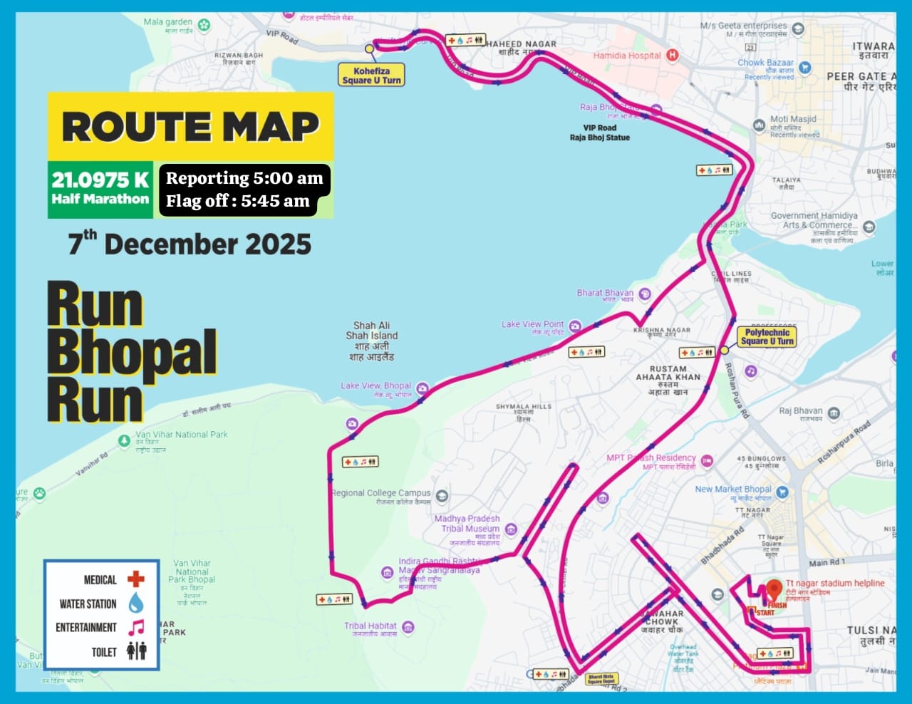 Start/ Finish:The medical tent area at TT nagar stadium is well equipped with trained medical staff, health workers and aid supplies with ambulance support. There will also be a physio area, where trained professionals will help you with stretching and massages.